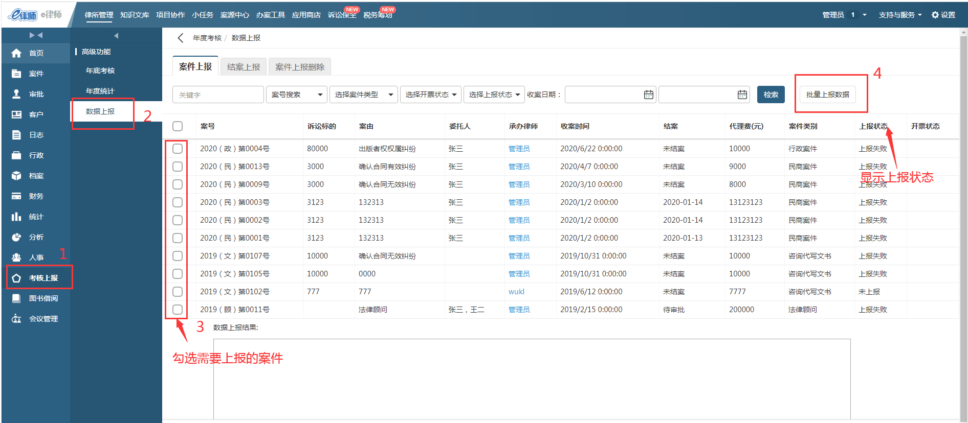 4、e律師功能在考核上報、數(shù)據(jù)上報中。分為案件上報、結(jié)案上報 、案件上報刪。