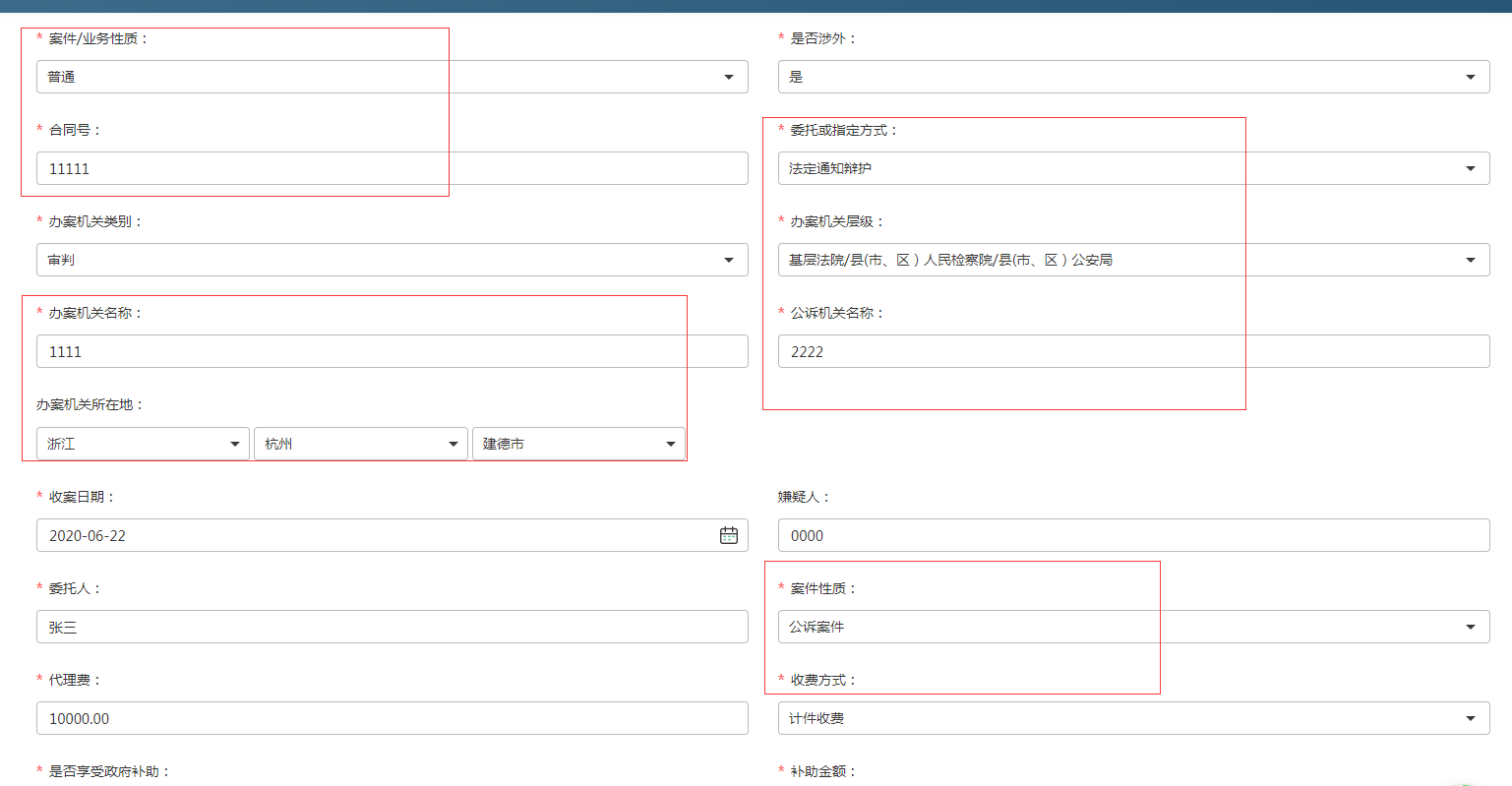 2、平臺對接后根據(jù)要求律師事務所在立案表中新增選項,在創(chuàng)建立案時填寫上報新數(shù)據(jù)。
