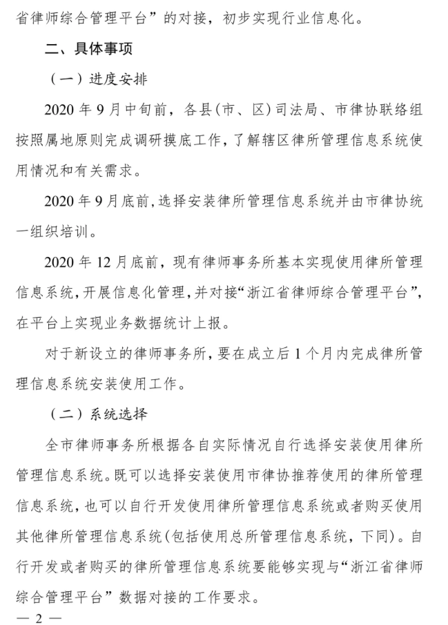 繼杭州、寧波市司法局之后,臺州市司法局、臺州市律協(xié)發(fā)布的臺律協(xié)(2020)05號文件:《關(guān)于全面推進(jìn)律師事務(wù)所信息化建設(shè)工作的通知》,預(yù)計目標(biāo)將于2020年12月底前,推進(jìn)臺州全市律師事務(wù)所信息化建設(shè)工作,并實現(xiàn)與浙江省律師綜合管理平臺完成對接,初步實現(xiàn)律師行業(yè)信息化。