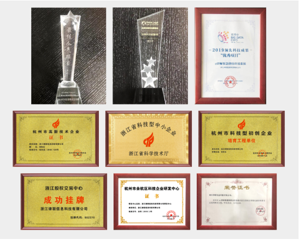 榮獲GLH2019第二屆全球法律科技黑客松大賽武漢賽區(qū)“法律科技創(chuàng)新獎”和“最佳人氣項目獎”;榮獲2019中國國際大數(shù)據(jù)博覽會“優(yōu)秀項目”獎項;榮獲2019全國政法智能化建設(shè)智慧司法優(yōu)秀解決方案獎;軟件著作權(quán)共19項。