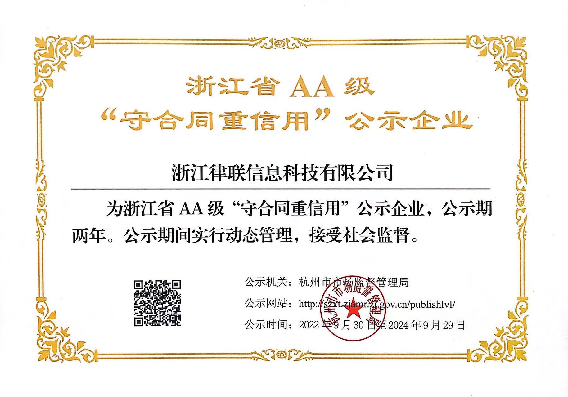 公司在2022年“守合同重信用”評比中,憑借良好的誠信經(jīng)營記錄和合同履約能力,經(jīng)過杭州市市場監(jiān)督管理局審核,榮獲浙江省AA級“守合同重信用”企業(yè)榮譽(yù)稱號。