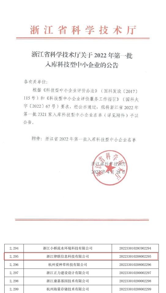 浙江省科學技術廳發布浙江省2022年第一批入庫科技型中小企業名單,律聯科技成功入選。
